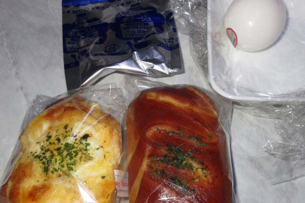 ハムエッグパン、焼きそばパン、コーンポタージュスープ、自家製ゆで玉子、自家製大根酢漬け