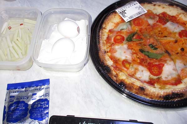 石窯マルゲリータピザ、自家製ゆで玉子、コーンポタージュスープ、自家製大根酢漬け